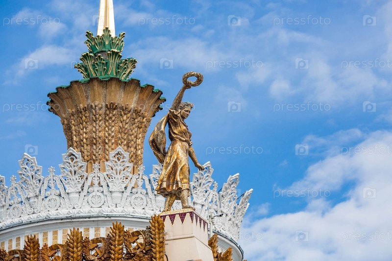Скульптура на карнизе павильона № 58 «Сельское хозяйство» «Украинская ССР». Позолоченная девушка с венком в руке. ВДНХ, Москва, Россия