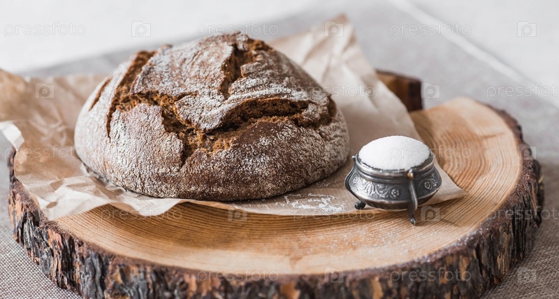 Свежий вкусный хлеб крупным планом и соль. Свежеиспеченный хлеб на закваске с золотой корочкой на деревянной доске. Контекст пекарни с вкусным хлебом. Кондитерские изделия