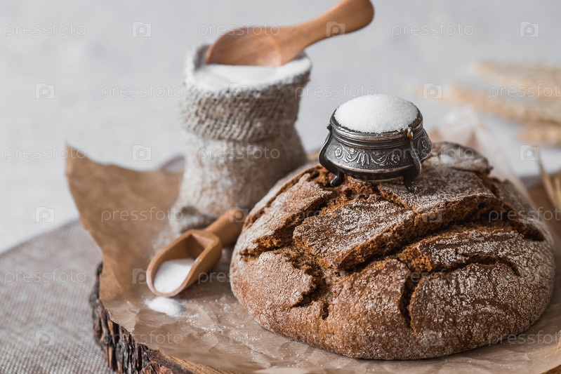 Свежий вкусный хлеб крупным планом и соль. Свежеиспеченный хлеб на закваске с золотой корочкой на деревянной доске. Контекст пекарни с вкусным хлебом. Кондитерские изделия