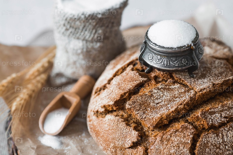 Свежий вкусный хлеб крупным планом и соль. Свежеиспеченный хлеб на закваске с золотой корочкой на деревянной доске. Контекст пекарни с вкусным хлебом. Кондитерские изделия