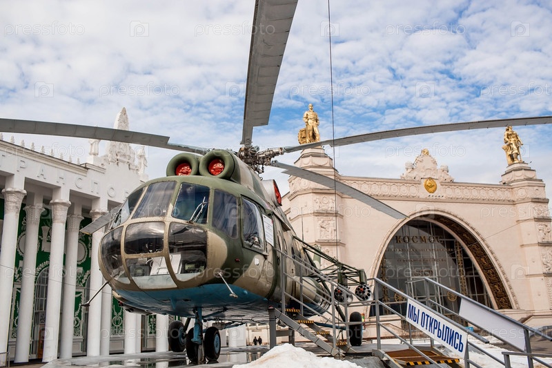 Советский вертолет Ми-8 на фоне павильонов "Транспорт" и "Космос" ВВЦ ВДНХ. Москва, Россия
