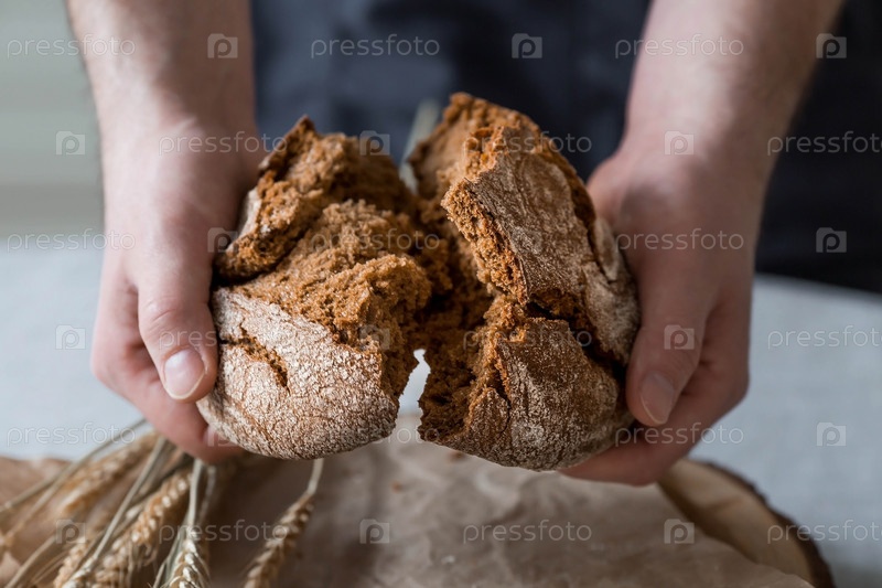 Свежий вкусный хлеб в руках мужчины-пекаря крупным планом. Свежеиспеченный хлеб на закваске с золотой корочкой на деревянной доске. Контекст пекарни с вкусным хлебом. Кондитерские изделия