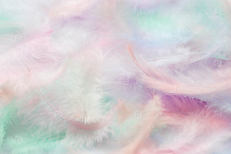 Красивый абстрактный фон из разноцветных перьев на белом фоне. Пушистая, мягкая текстура перьев пастельных тонов. Нежное знамя