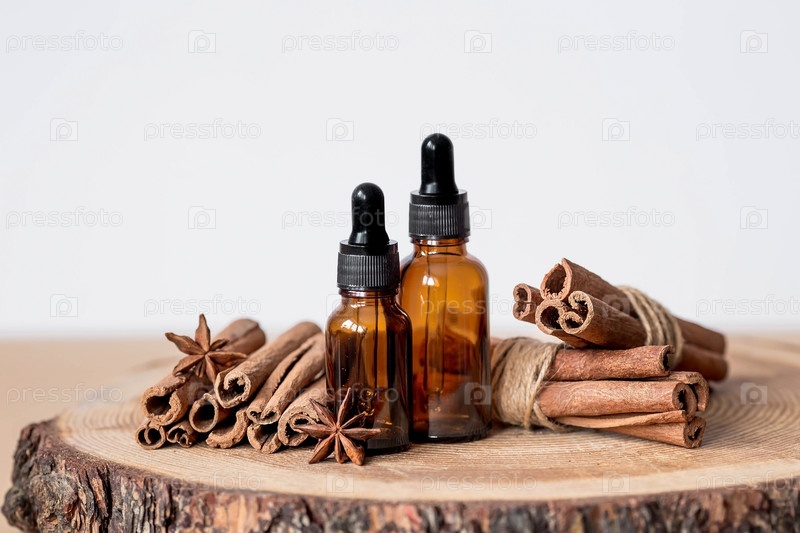 Ароматерапия. Массаж и спа. Косметические флаконы с эфирным маслом, палочками корицы и звездчатым анисом на деревянной подставке. Натуральная косметика для тела