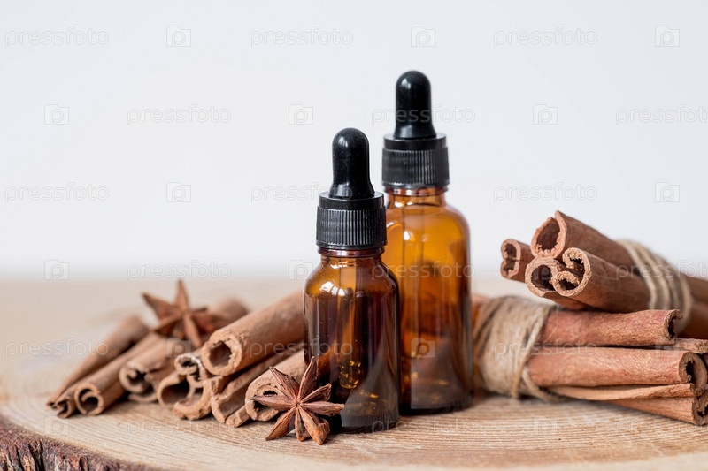 Ароматерапия. Массаж и спа. Косметические флаконы с эфирным маслом, палочками корицы и звездчатым анисом на деревянной подставке. Натуральная косметика для тела