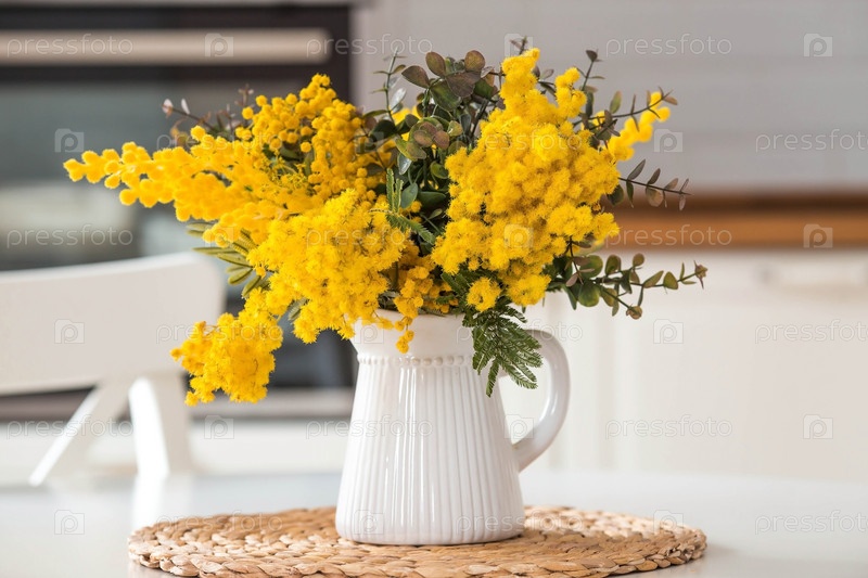 Букет мимозы на белом столе. На заднем плане интерьер белой кухни в скандинавском стиле. Понятие домашнего уюта. Концепция Международного женского дня 8 марта