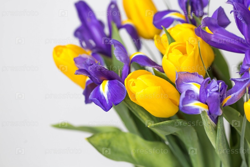 Букет желтых тюльпанов и фиолетовых ирисов на белом изолированном фоне. Концепция наступления весны и Международного женского дня 8 марта