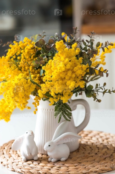 Букет мимозы и белых кроликов на белом столе. На заднем плане интерьер белой кухни в скандинавском стиле. Понятие домашнего уюта. Концепция Международного женского дня 8 марта