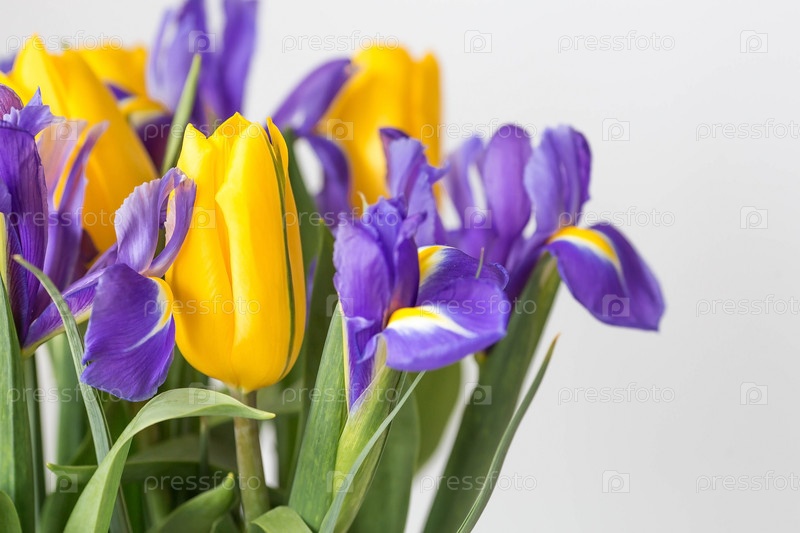 Букет желтых тюльпанов и фиолетовых ирисов на белом изолированном фоне. Концепция наступления весны и Международного женского дня 8 марта