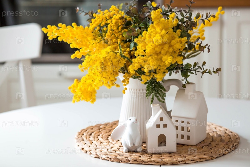 Букет мимозы, белые домики и белые кролики на белом столе. На заднем плане интерьер белой кухни в скандинавском стиле. Понятие домашнего уюта. Концепция Международного женского дня 8 марта