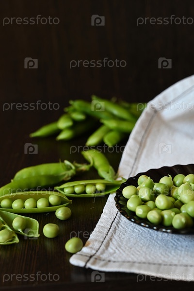Зеленые побеги молодого гороха, цветов и стручков на темном деревянном фоне. выборочная фокусировка