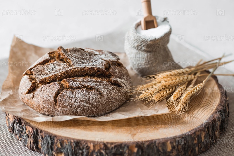 Свежий вкусный хлеб крупным планом и соль. Свежеиспеченный хлеб на закваске с золотой корочкой на деревянной доске. Контекст пекарни с вкусным хлебом. Кондитерские изделия