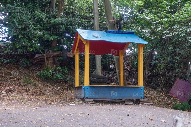 Старая заброшенная беседка у дороги в сельской местности. Рядом электрический столб и старая входная дверь, обитая кожзаменителем