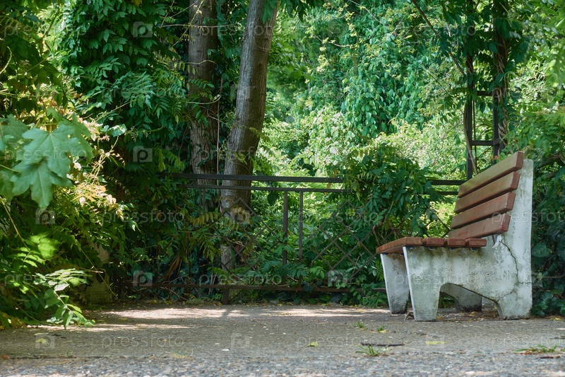 В беседке среди тропической растительности есть бетонная скамья. Скамейка отделана деревянными панелями, обнесена металлическим забором