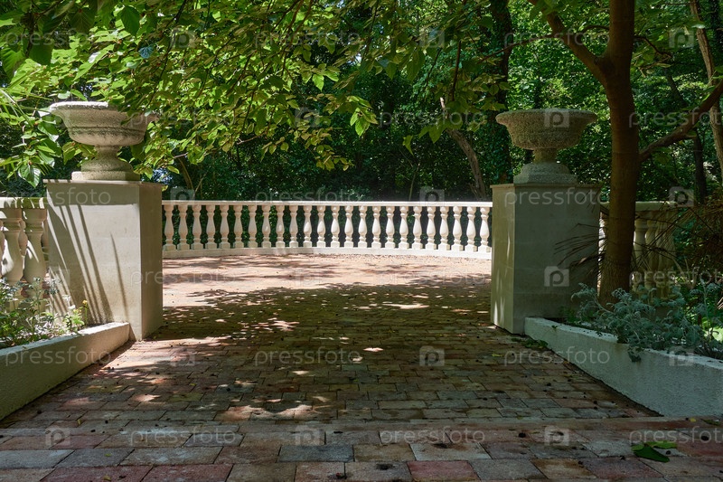 Вход на смотровую площадку в тропическом лесу. Тротуар вымощен натуральным камнем