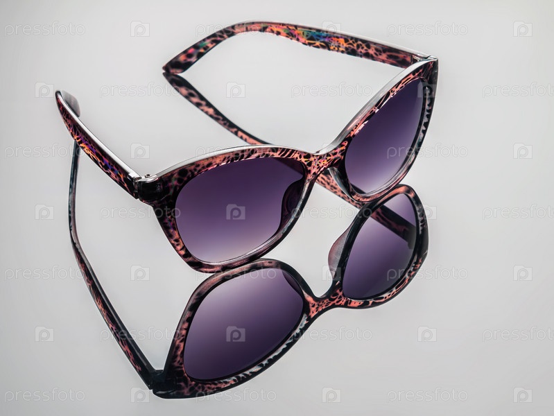 Развернутые женские темно-фиолетовые солнцезащитные очки с цветными оправами на светлом фоне, с отражением, линзы вперед. Студийный снимок. Горизонтальный