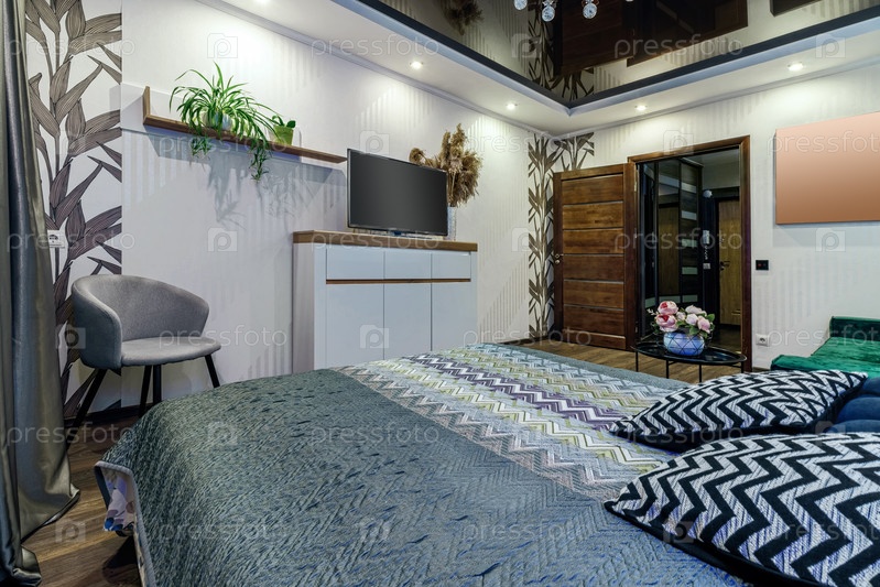 Современный номер с кроватью, удобным серым креслом и телевизором
