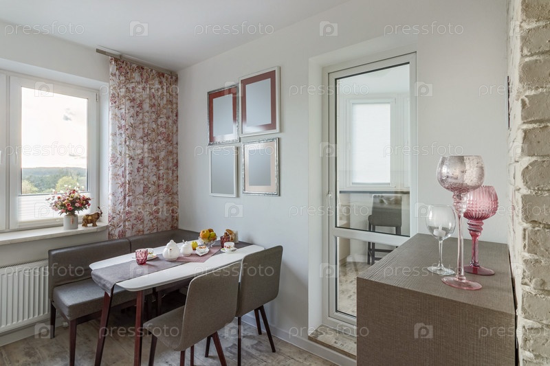 Стильный дизайн интерьера столовой с обеденным столом. Креативные стены, белые и деревянные панели