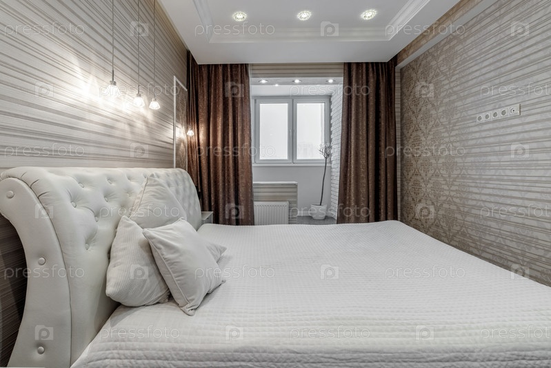 Светлая спальня с большой белой кроватью и изголовьем капитоне