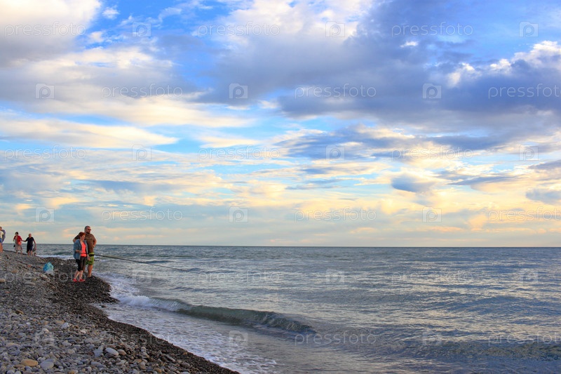 Рыбаки ловят рыбу с берега на вечерней заре в Лазаревском