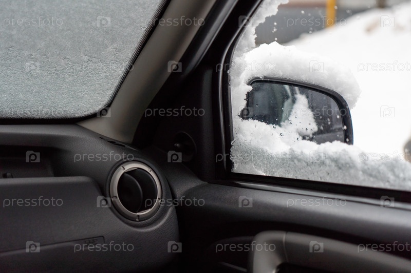 Лобовое стекло машины под слоем снега, зимнее замерзшее окно автомобиля