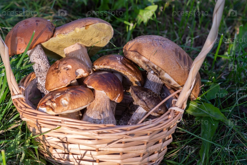 Полная корзина ароматных съедобных грибов, собранных в лесу