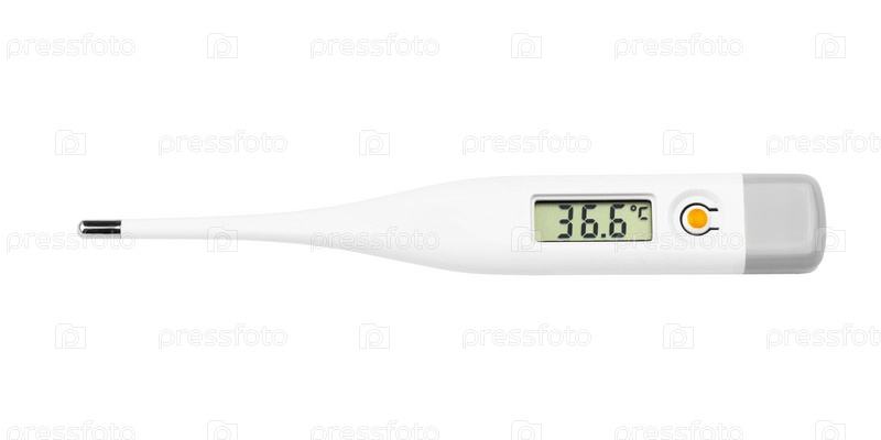 Цифровой термометр, показывающий температуру 36,6 C на белом фоне, изолированный