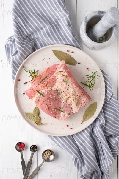 Кусок свежей сырой свинины со специями на белом деревянном столе. Мясо со специями