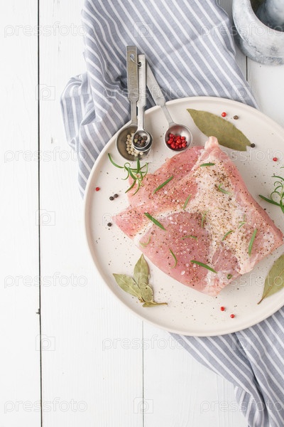 Кусок свежей сырой свинины со специями на белом деревянном столе. Мясо со специями