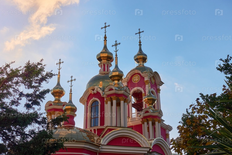 Храм Пантелеймона Целителя в Сочи в окружении елей и пальм на фоне голубого облачного неба