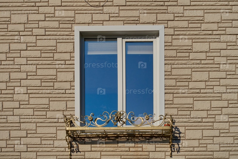 Пластиковое окно с кованым подоконником на стене. В окне отражается голубое небо. Стена отделана натуральным плоским камнем