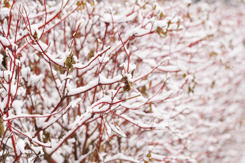 Заснеженные красные ветки крупным планом. Горизонтальное изображение