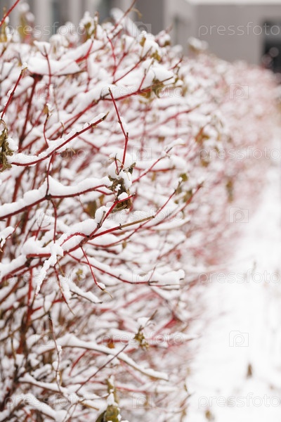 Заснеженные красные ветки крупным планом. Вертикальное изображение