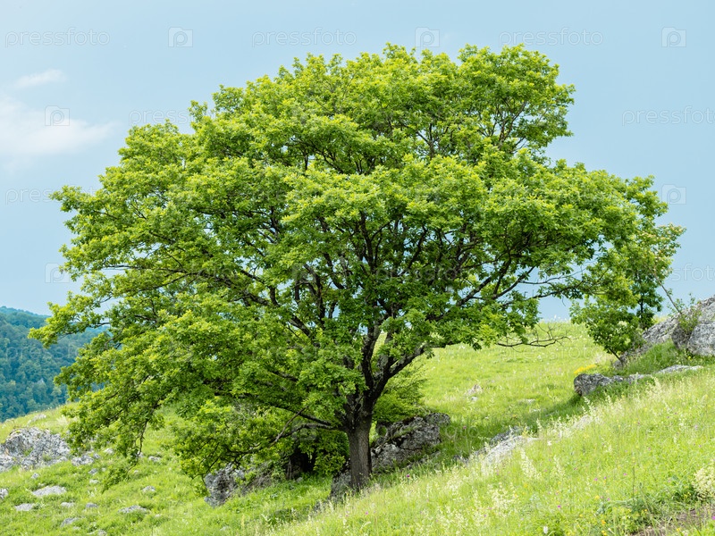 Раскидистое дерево с зеленой листвой на фоне голубого неба. Дерево стоит на склоне горы среди травы и скал. Концепция одиночества