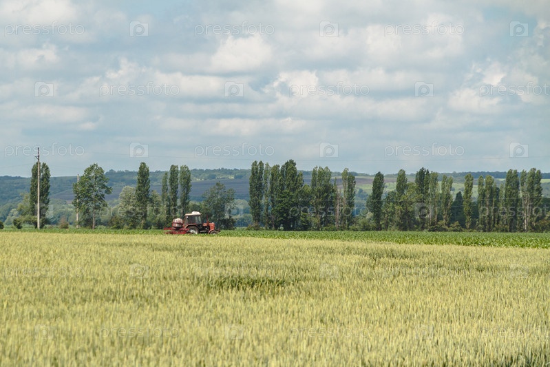 Зеленое поле с молодой пшеницей. На заднем плане красный трактор, тополя и небо с облаками. Концепция развития сельского хозяйства