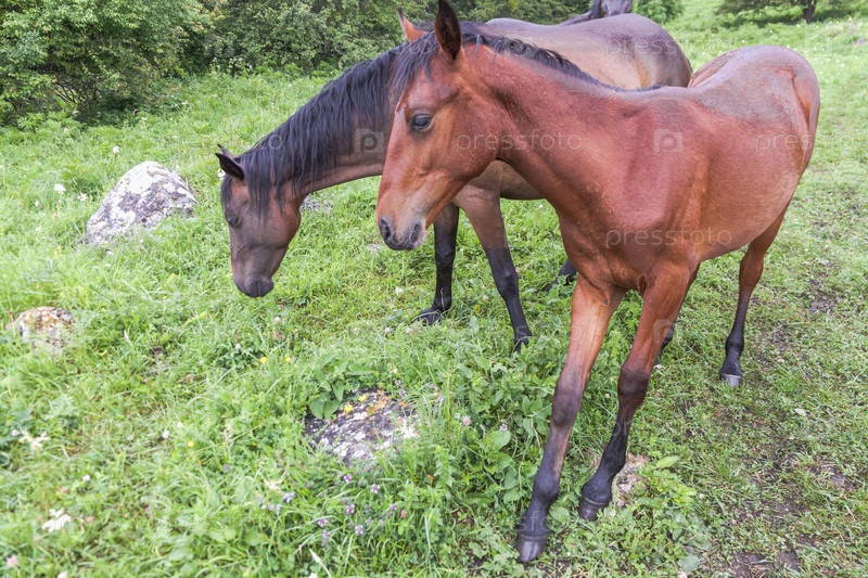 Крупный план двух коричневых лошадей на фоне зеленой травы. Концепция животноводства