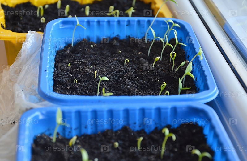 Маленькие саженцы помидоров в лотке для рассады