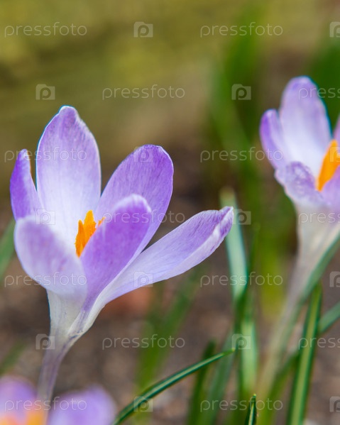 Весенняя цветочная открытка на День матери нежные цветы крокусов небольшая глубина резкости. Цветущий фиолетовый весенний цветок на зеленоватом фоне