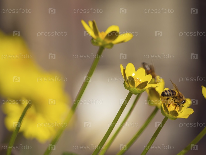 Пчела собирает пыльцу на первых маленьких желтых цветках весны