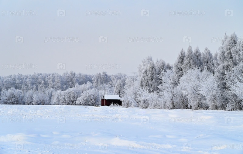 Зимний лес в мороз, дом в зимнем лесу, морозный день