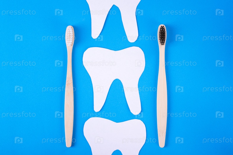 Бумажные зубы и бамбуковые зубные щетки на синем фоне. Стоматолог и гигиена полости рта. Гигиенический инструмент из биоразлагаемых экологически чистых материалов. Концепция детской стоматологии