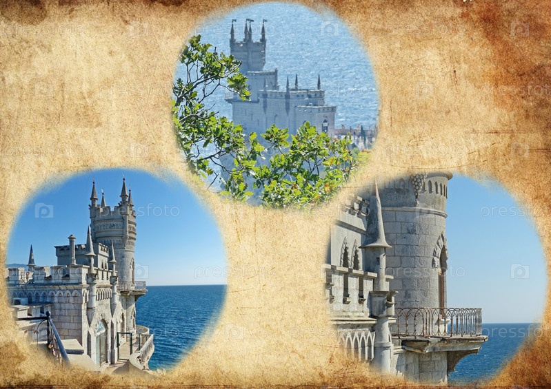 Фотоколлаж - Ласточкино гнездо, готический замок над обрывом моря, эмблема Южного берега Крыма. Расположен на крутой 40-метровой скале Аврора мыс Ай-Тодор в Большой Ялте. Южный берег Крыма