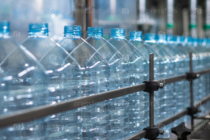 Пустые синие пятилитровые пластиковые бутылки на конвейерной ленте. Автоматизированное производство питьевой воды
