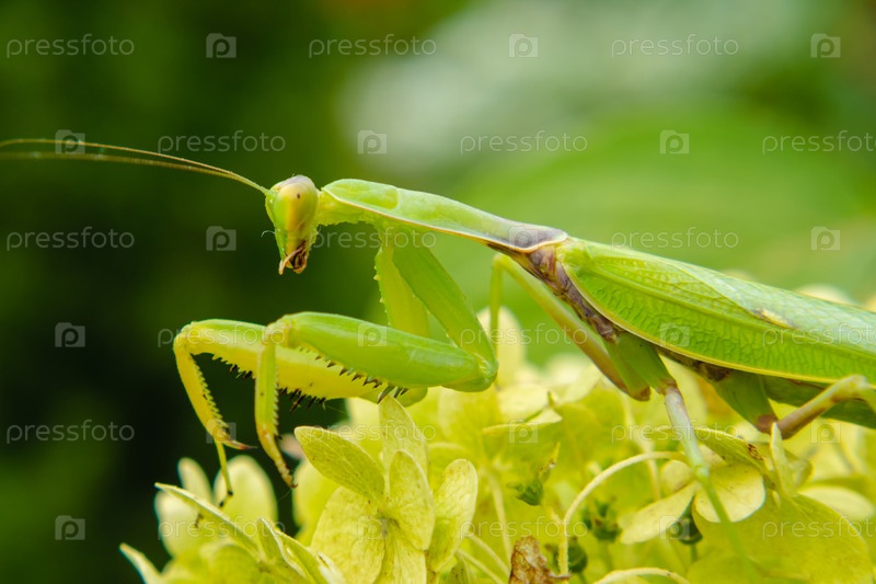 Большой зеленый богомол сидит на листьях цветка. Макро фото. Размытый фон. Понятие о диких насекомых