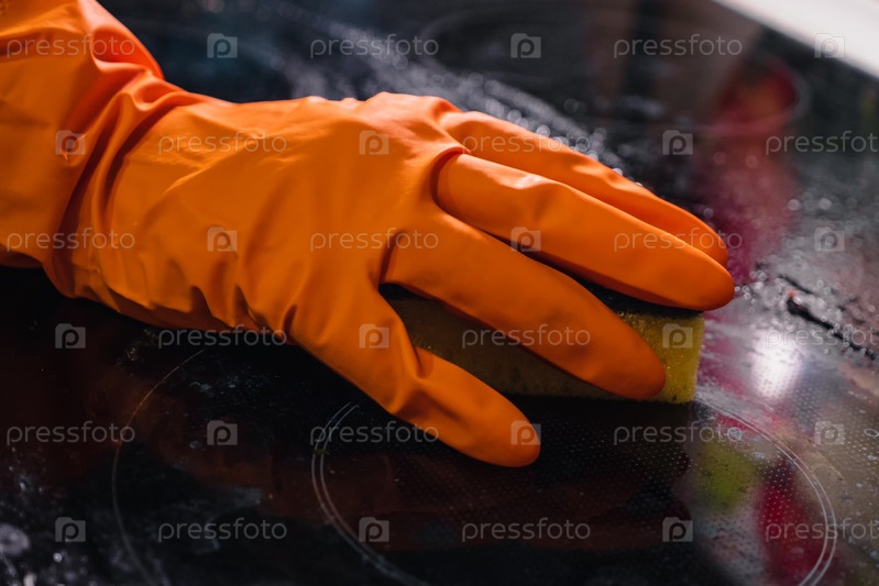 Оранжевая перчатка с желтой губкой чистит грязную варочную панель. Концепция уборки дома