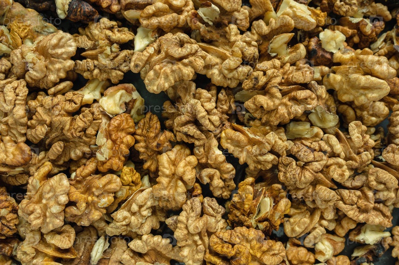 Фон из кучи очищенных половинок грецкого ореха. Вид сверху. Крупный план