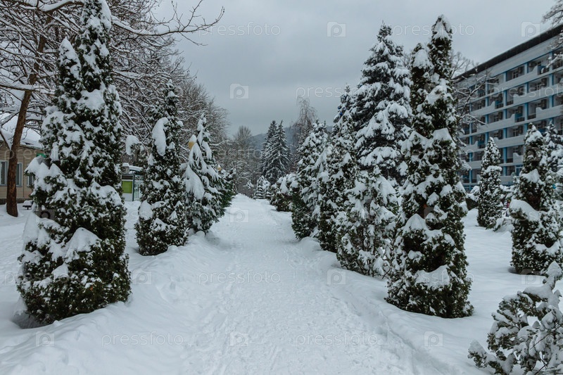 Заснеженная аллея сосен в городском парке. Зимний городской пейзаж