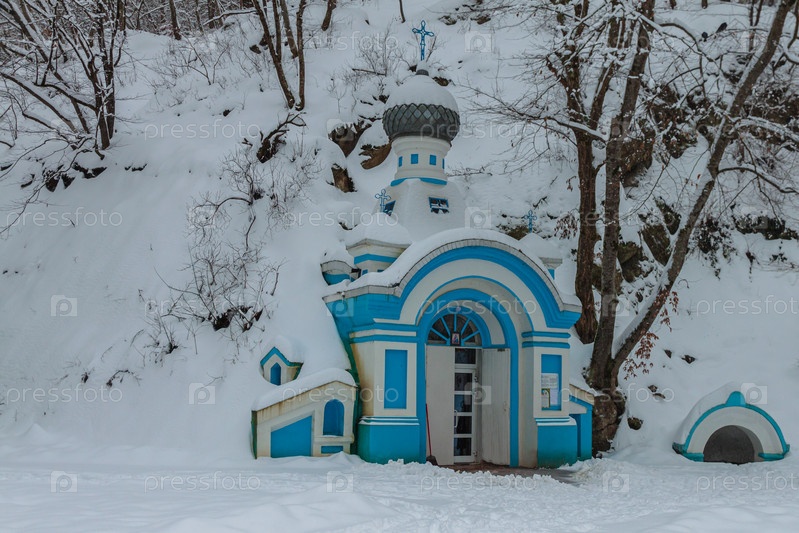 Бело-голубая христианская часовня, встроенная в скалу. Все засыпано снегом. Зимний городской пейзаж