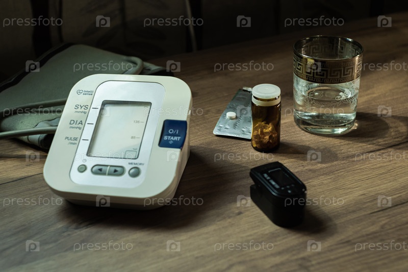 На деревянном столе есть тонометр, стакан воды, таблетки и оксиметр. Концепция здоровья