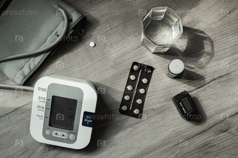 На столе таблетки, прибор для измерения артериального давления, стакан воды и оксиметр. Черно-белое фото. Вид сверху. Концепция здоровья